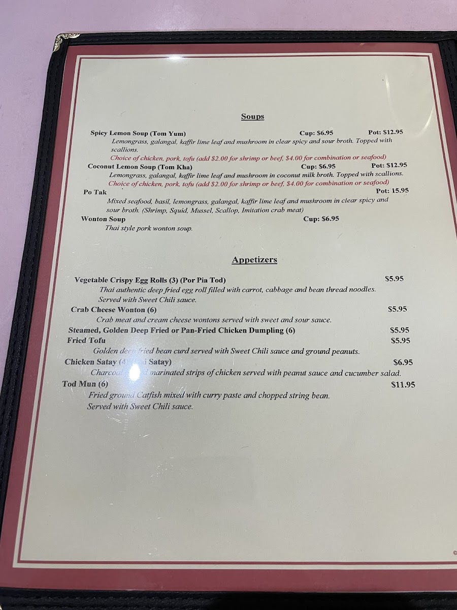 Lemongrass, galangal, kaffir lime leaf and mushroom in clear spicy and sour broth. Topped with scallions. Choice of chicken, beef, pork, tofu or add an additional cost for shrimp.